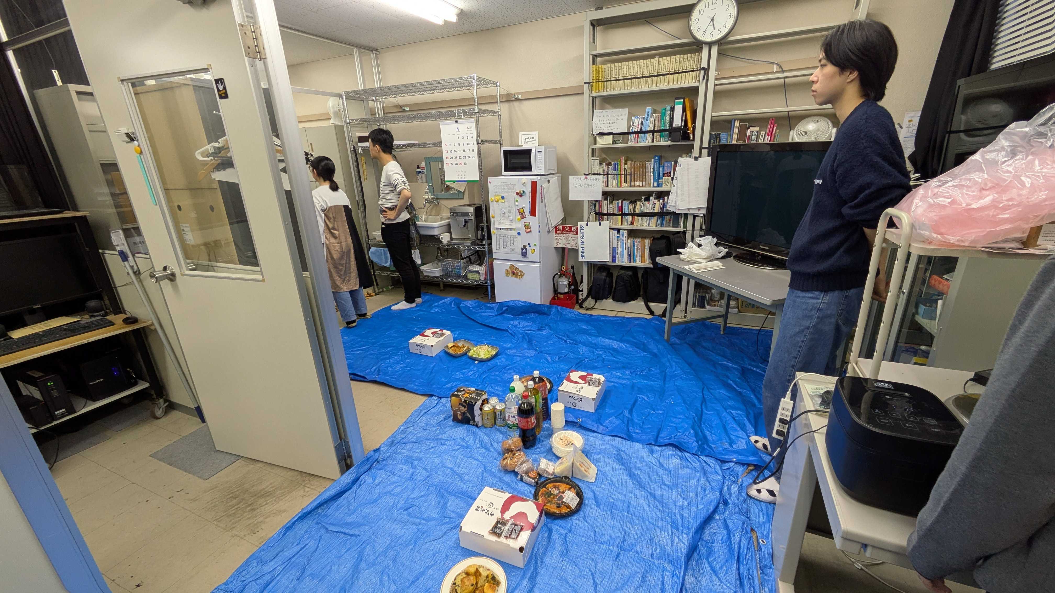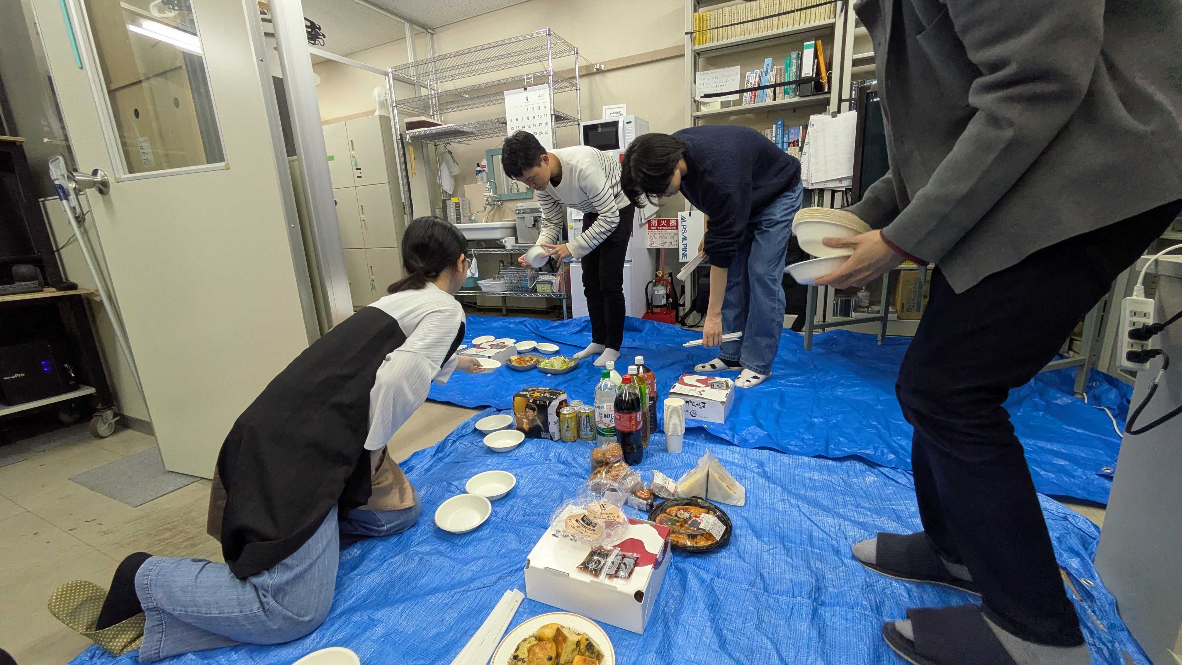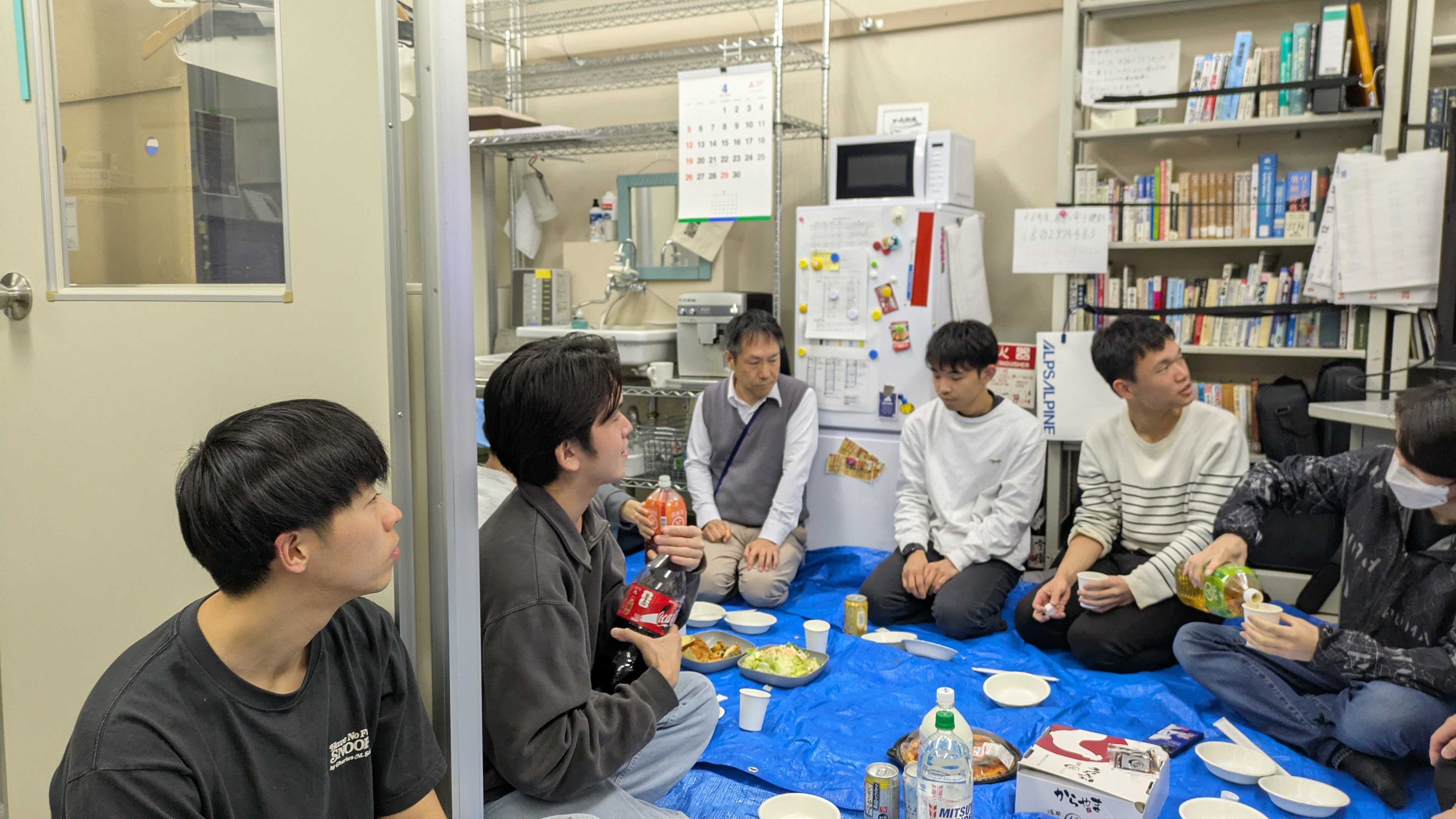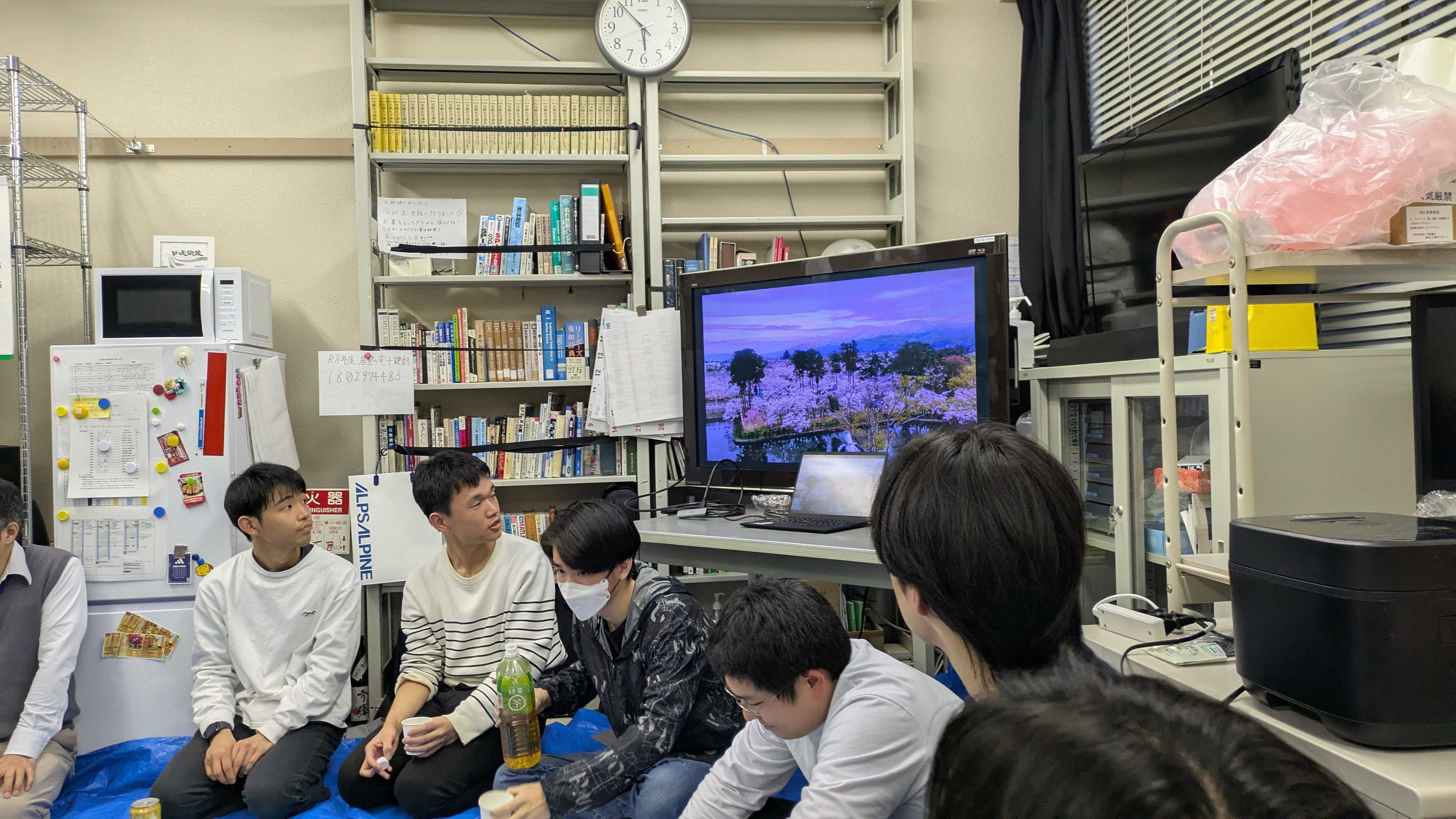 新年度がスタートし、長岡市では桜が満開の時期を迎えました。残念ながら今年の花見会は天候に恵まれない中でしたが、 学生たちが工夫を凝らして"室内花見"を実施しました。また、軽食を囲み、末松先生の研究室から異動された学生(王さん、松野さん、別所さん)と、 水谷さんの歓迎会も行いました。🌸
